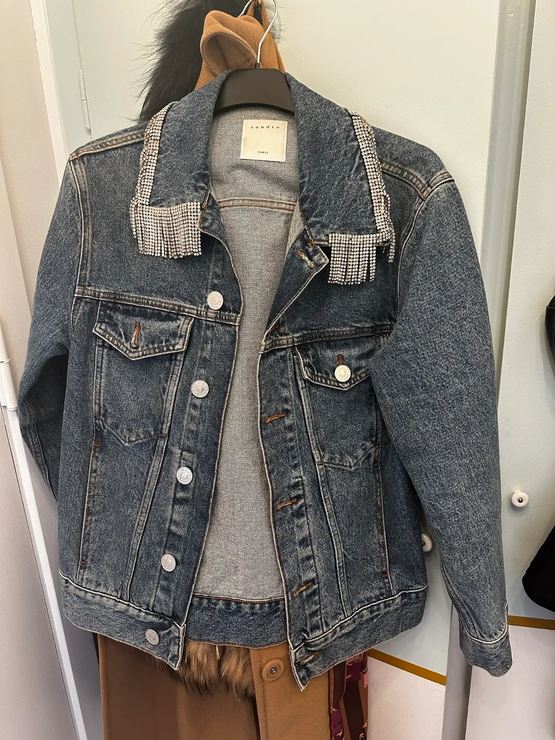Product Item: Sandro denim jacket hot sale with rhinestone fringe